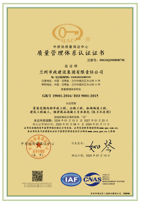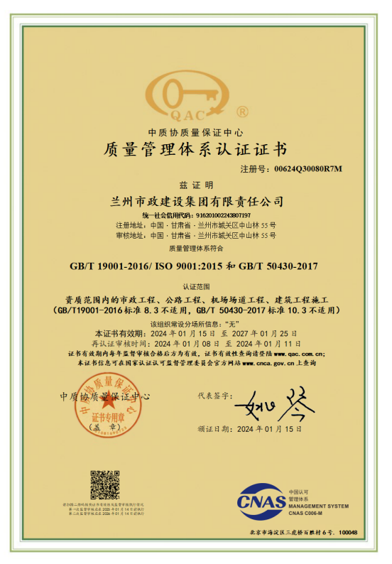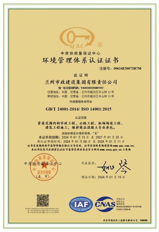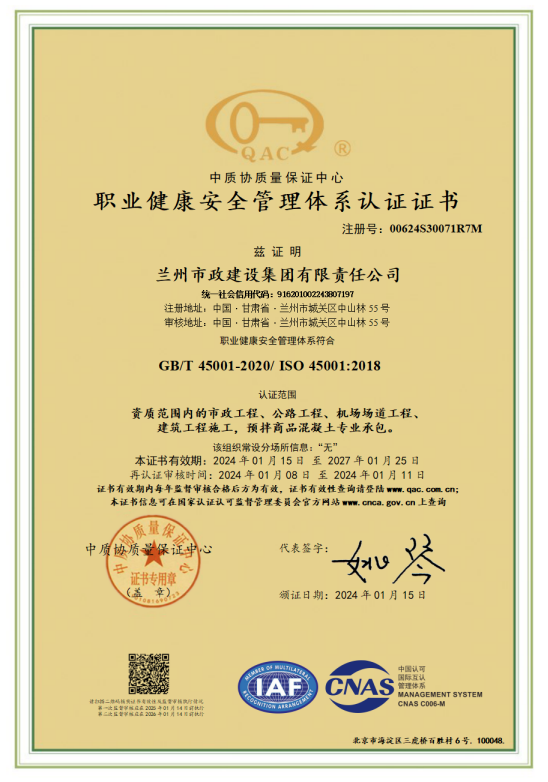 1月23日,蘭州市政建設(shè)集團順利通過ISO9001質(zhì)量管理體系、ISO14001環(huán)境管理體系、ISO45001職業(yè)健康安全管理體系再認證審核,蘭州市政建設(shè)集團已連續(xù)27年通過ISO綜合管理體系認證。