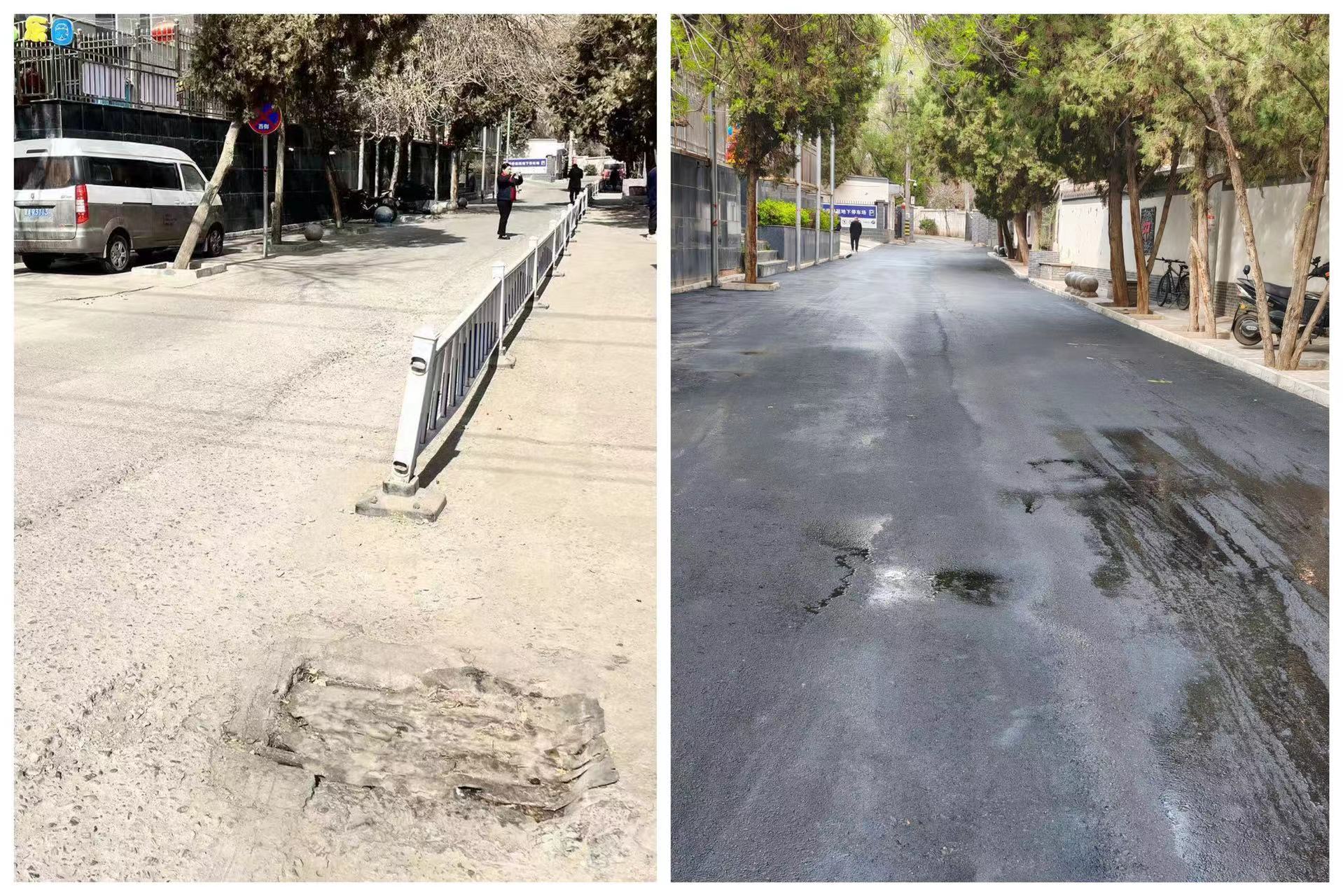 作為轄區(qū)共建單位,在接到培黎街道向陽社區(qū)的求助后,公司高度重視,立即安排道面工程公司與社區(qū)對接。道面工程公司第一時間組織相關(guān)人員前往市政巷道路進行實地勘察,根據(jù)現(xiàn)場情況確定施工方法,明確施工任務(wù),制定作業(yè)計劃。4月8日,道面工程公司組織作業(yè)隊伍與施工機械進場施工,銑刨拆除混凝土舊路面,提升檢查井,噴灑粘層油,鋪筑4cm瀝青混凝土,連夜施工。總計花費近10萬元,原本破損的路面煥然一新,居民“出行難”的問題得到及時解決。