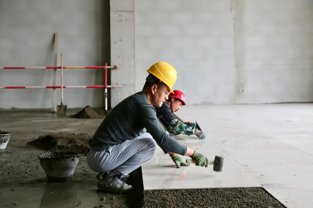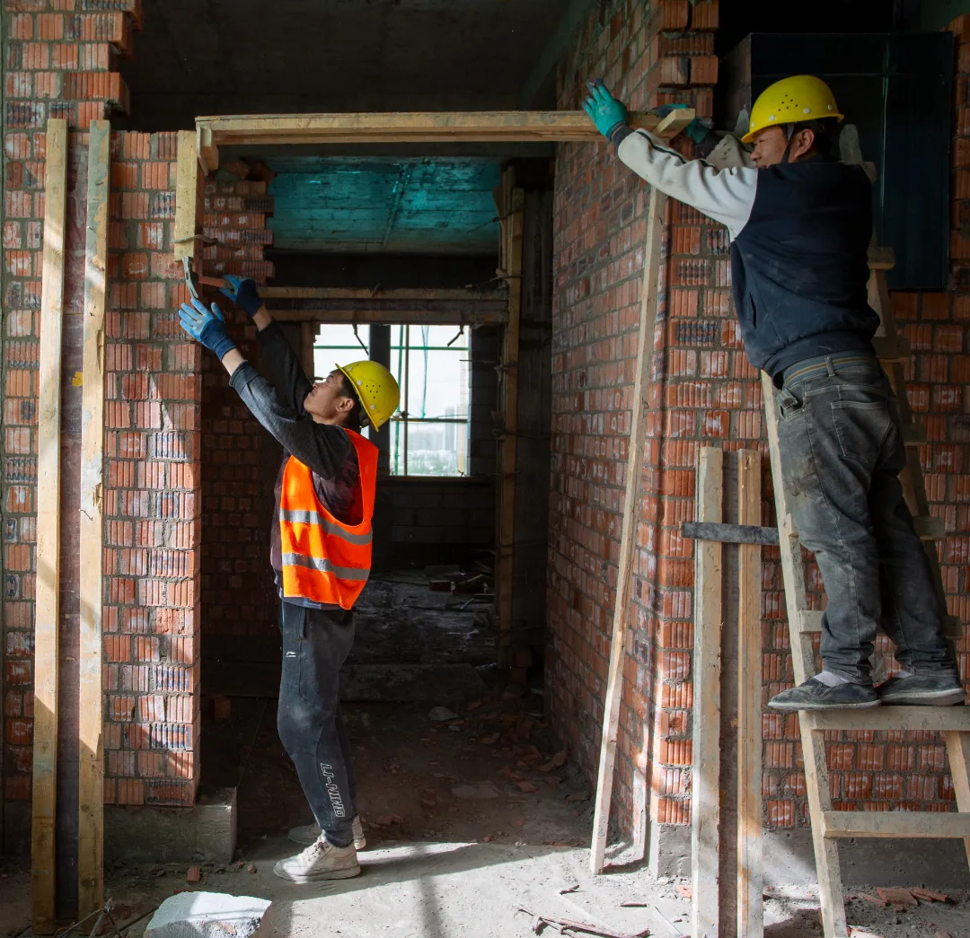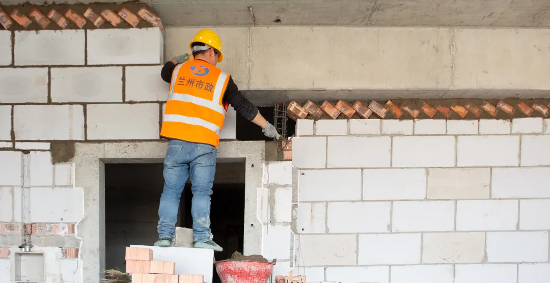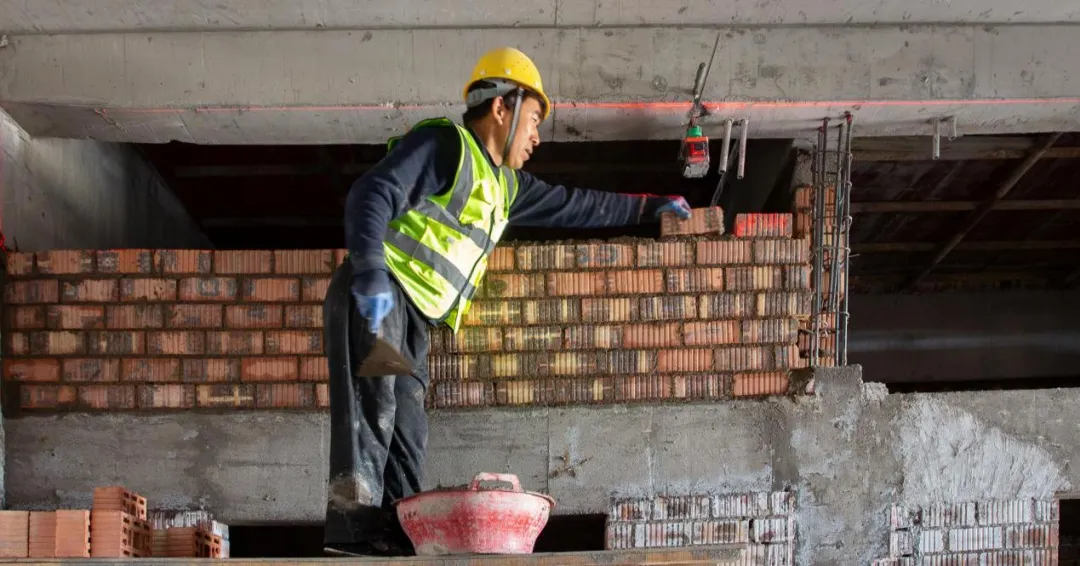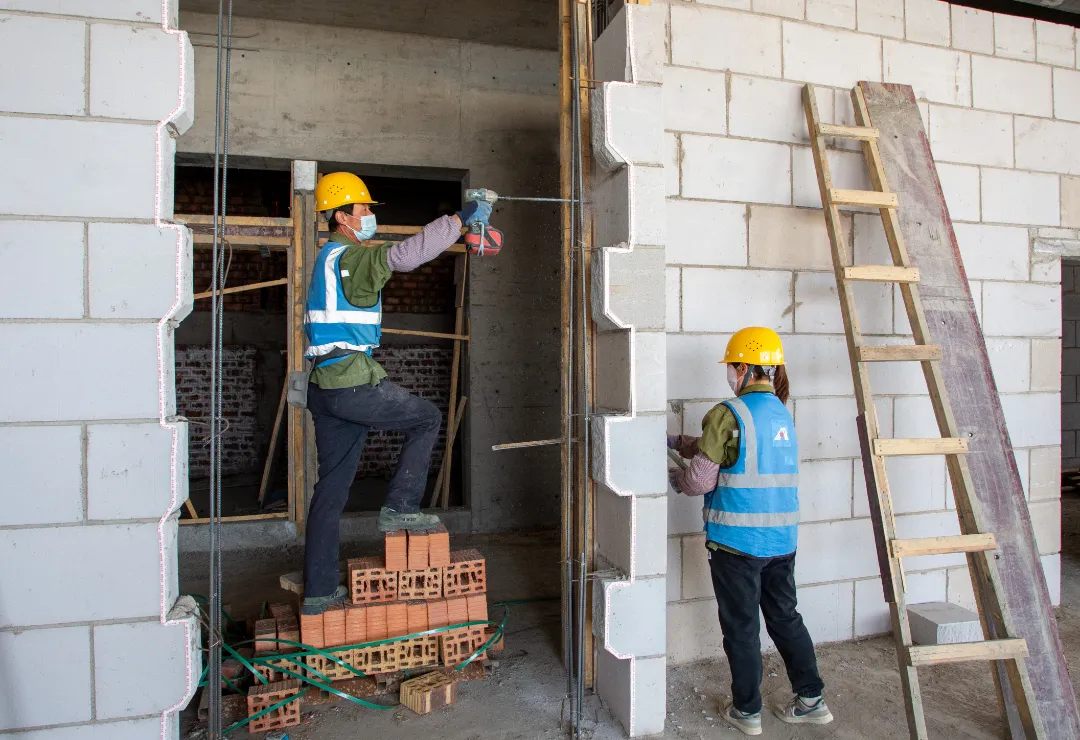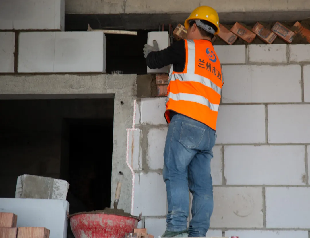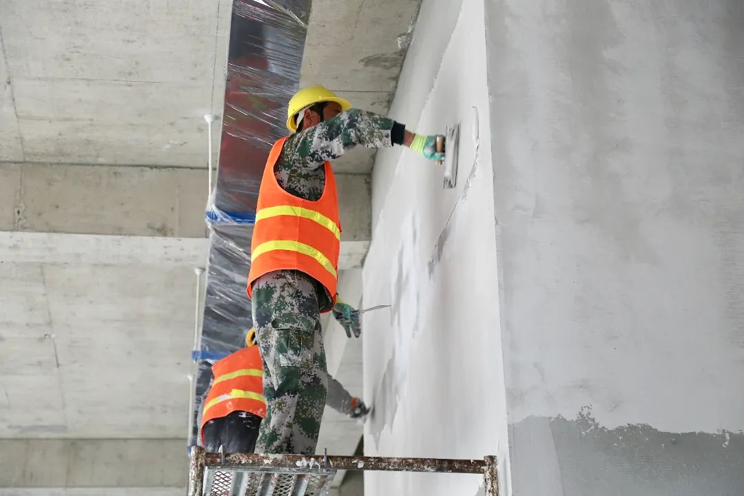 現(xiàn)場施工人員正在進行逐層大規(guī)模層砌體砌筑、內(nèi)墻抹灰、墻面膩子涂料、外墻粉刷等施工。
