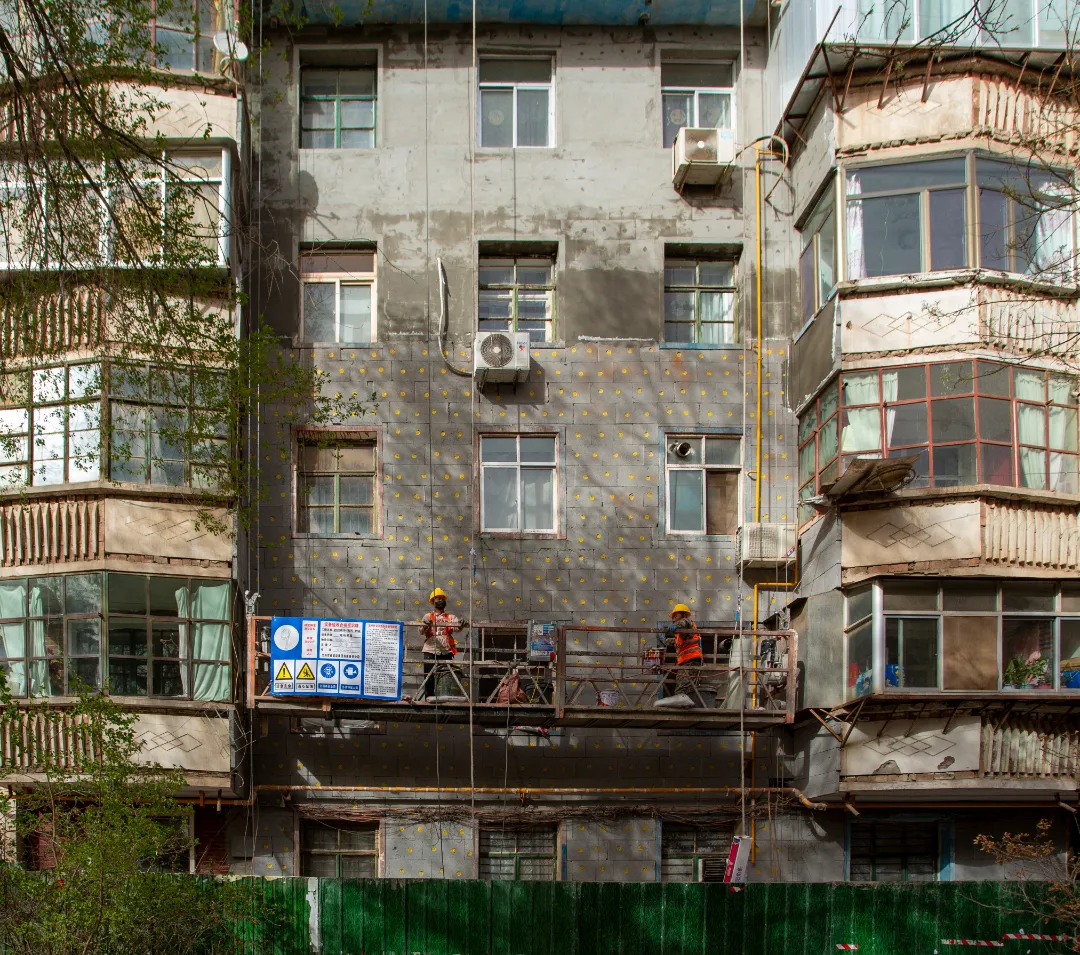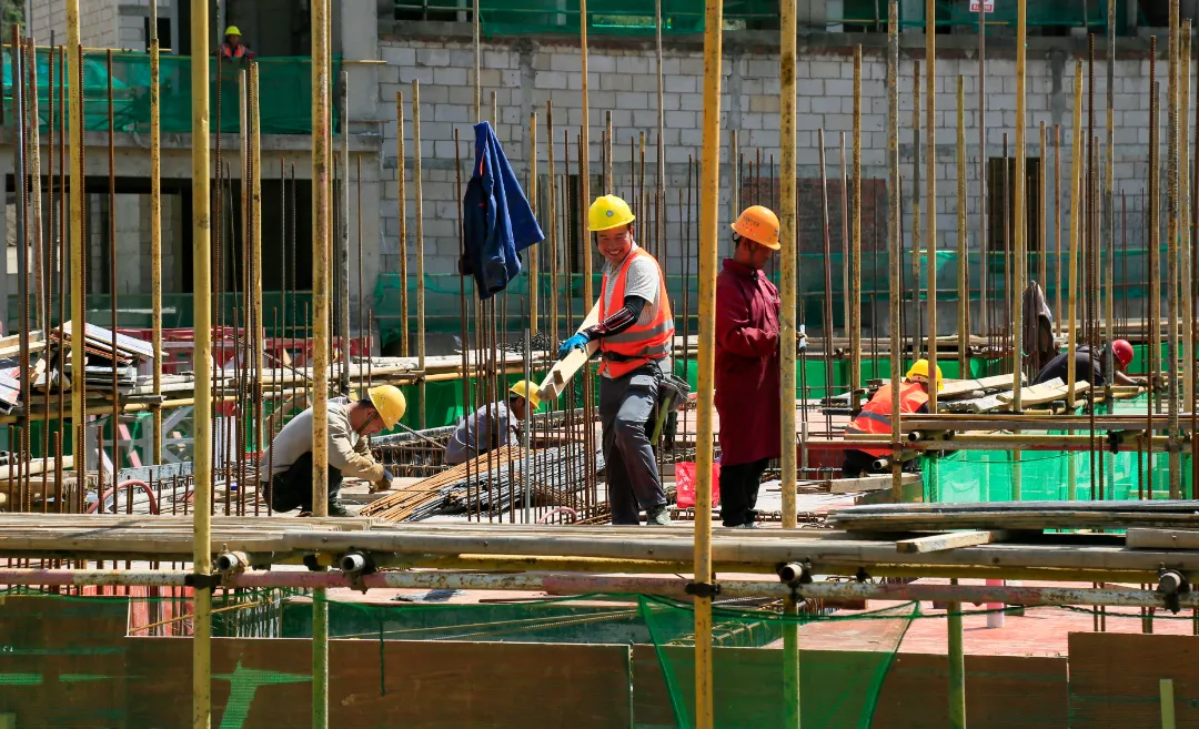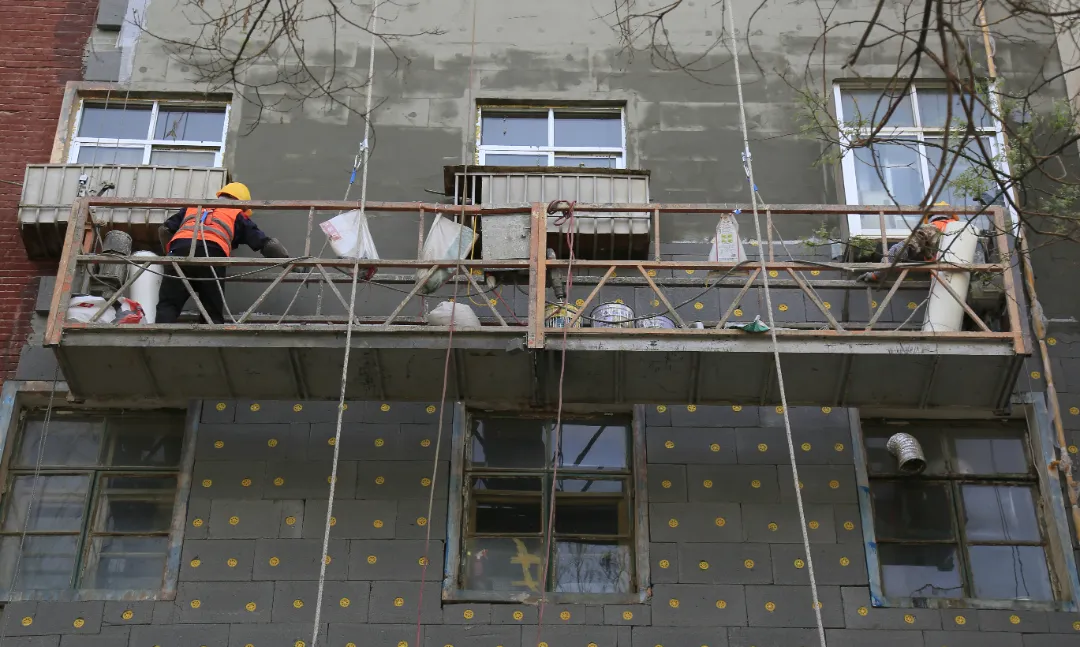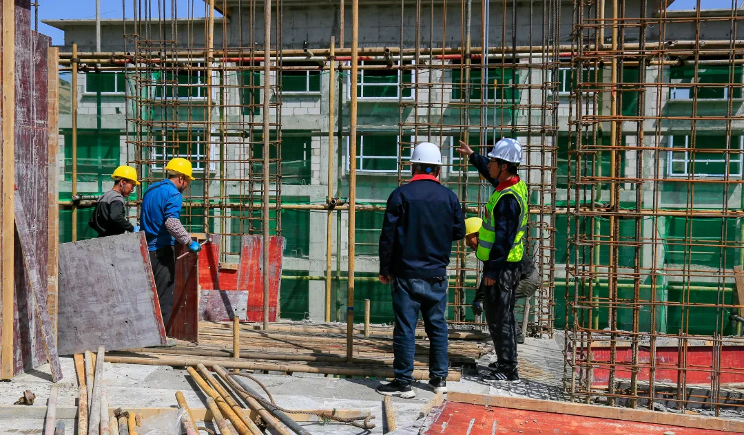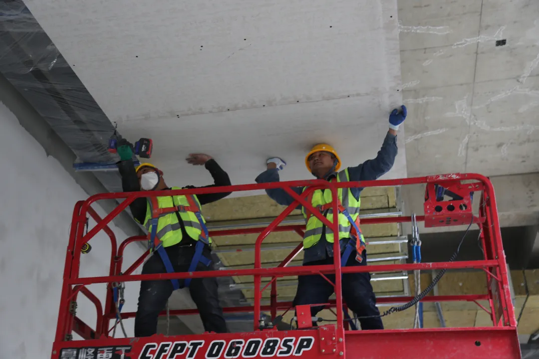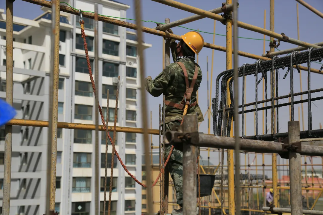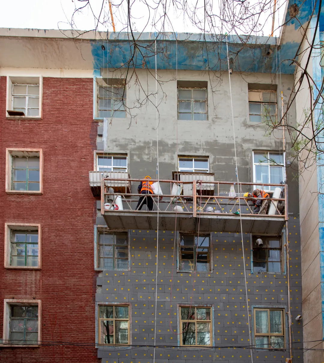 現(xiàn)場施工人員正在進行逐層大規(guī)模層砌體砌筑、內(nèi)墻抹灰、墻面膩子涂料、外墻粉刷等施工。