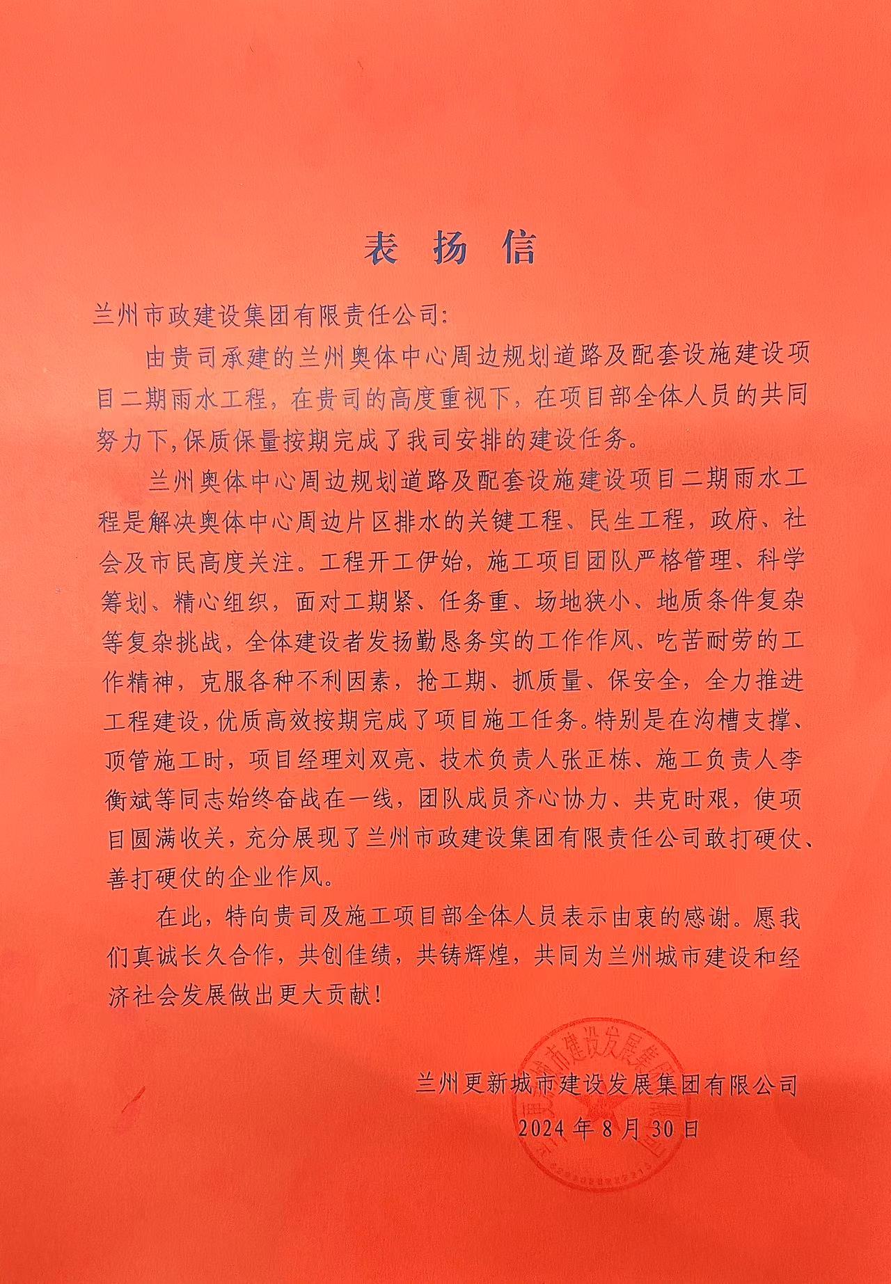 近日,蘭州市政建設(shè)集團收到業(yè)主單位蘭州更新城市建設(shè)發(fā)展集團有限公司的一封表揚信。對我司承建的蘭州奧體中心周邊規(guī)劃道路及配套設(shè)施建設(shè)項目二期雨水工程,圓滿地完成施工任務,表示衷心的感謝。