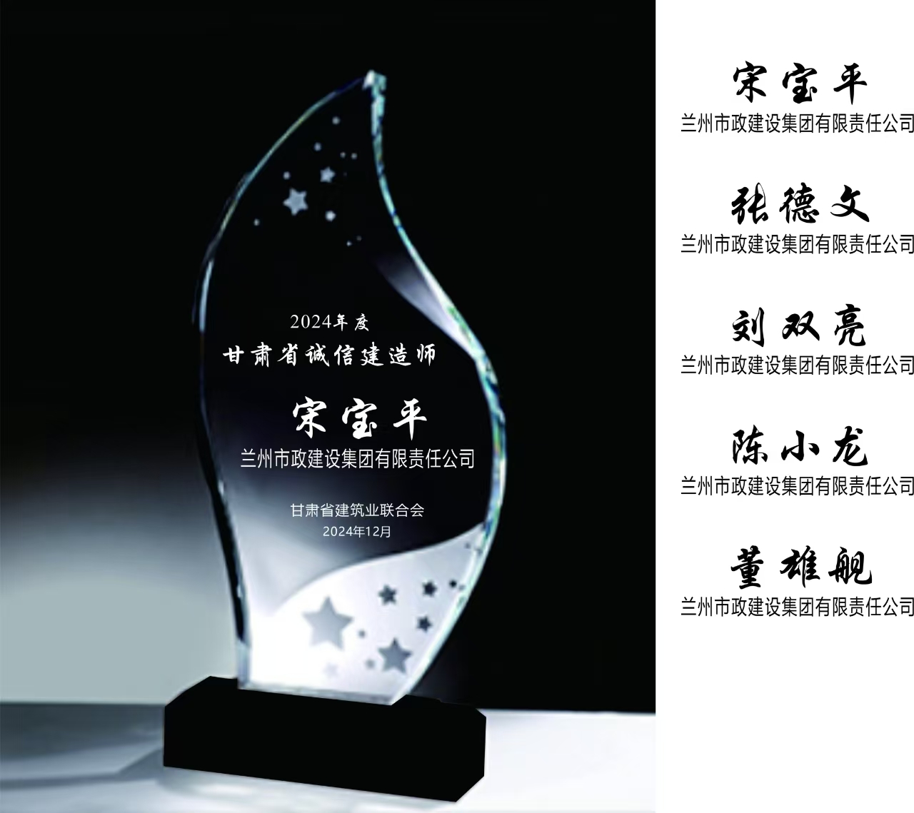 宋寶平、張德文、劉雙亮、陳小龍、董雄艦5名同志獲得“甘肅省誠信建造師”榮譽稱號。