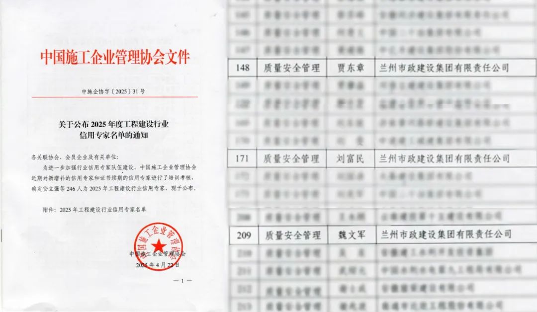 近日,中國(guó)施工企業(yè)管理協(xié)會(huì)公布2025年度工程建設(shè)行業(yè)信用專家名單,蘭州市政建設(shè)集團(tuán)賈東章、劉富民、魏文軍3人被確定為工程建設(shè)行業(yè)信用專家,標(biāo)志著公司在工程信用體系建設(shè)領(lǐng)域的專業(yè)能力獲得行業(yè)認(rèn)可。